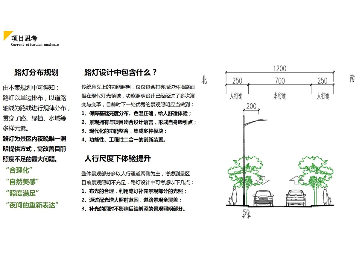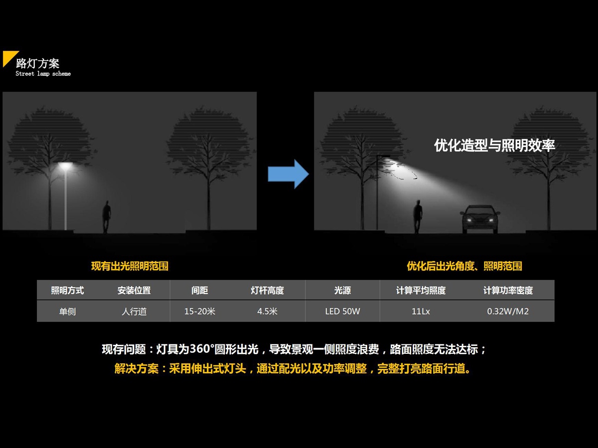 路燈為景區(qū)內(nèi)夜晚唯一照明提供方式,需改善目前照度不足的最大問題。