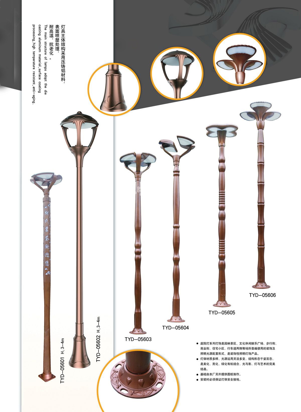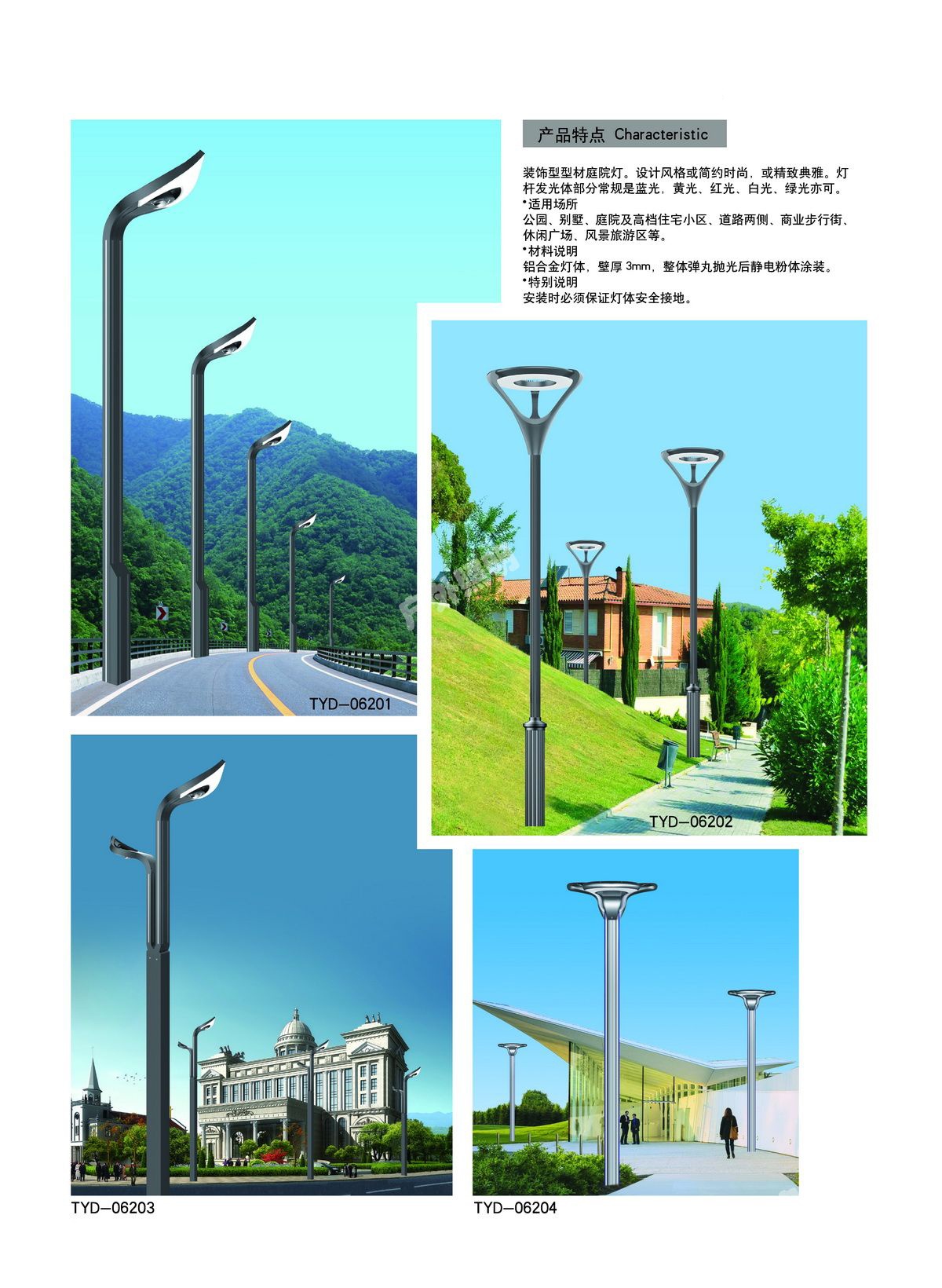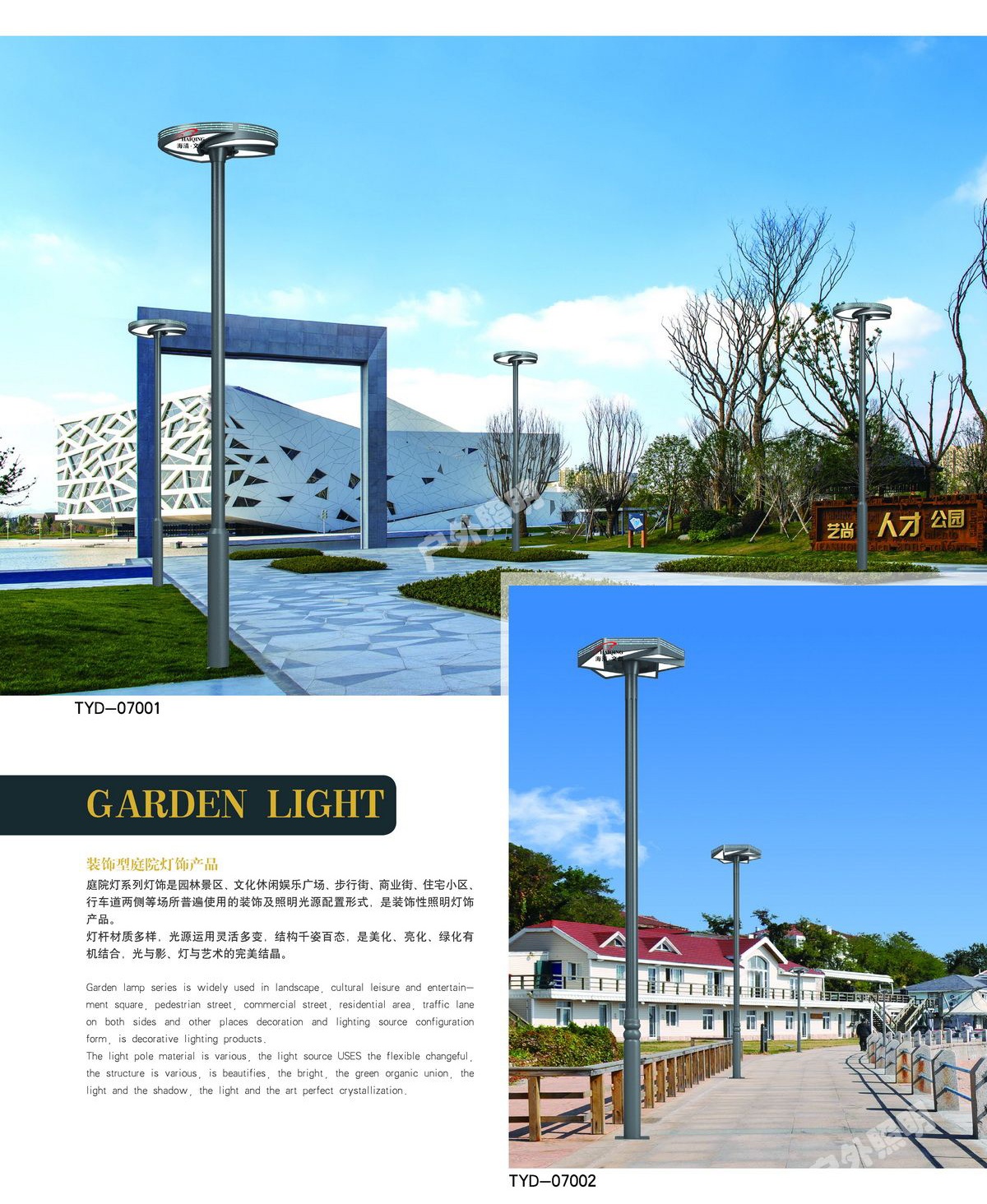 庭院燈其具有多樣性、美觀性具有美化和裝飾環(huán)境的特點,所以也被稱之為景觀庭院燈。主要應(yīng)用于城市慢車道、窄車道、居民小區(qū)、旅游景區(qū),公園、廣場等公共場所的室外照明,能夠延長人們的戶外活動的時間,提高財產(chǎn)的安全。