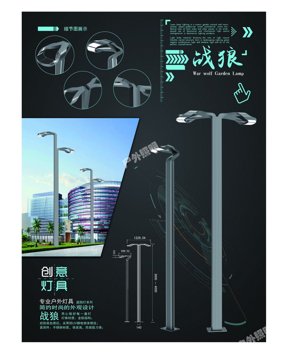 庭院燈被廣泛運用于城市慢車道、窄車道、居民小區(qū)、旅游景區(qū)、公園、廣場、私家花園、庭院走廊等公共場所的道路單側(cè)或倆冊用來道路照明,提高人們夜間出行的安全性用來增加人們戶外活動的時間,提高生命財產(chǎn)的安全。